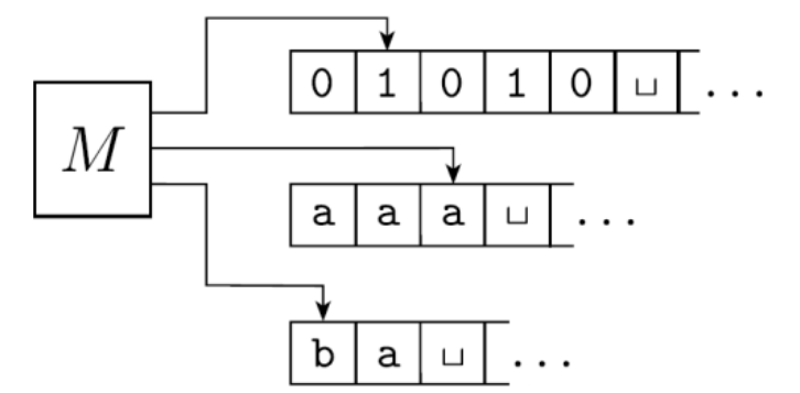 Geralmente, no início da execução desse tipo de máquina, uma das fitas conterá a palavra a ser usada na execução e as demais iniciarão totalmente vazias.